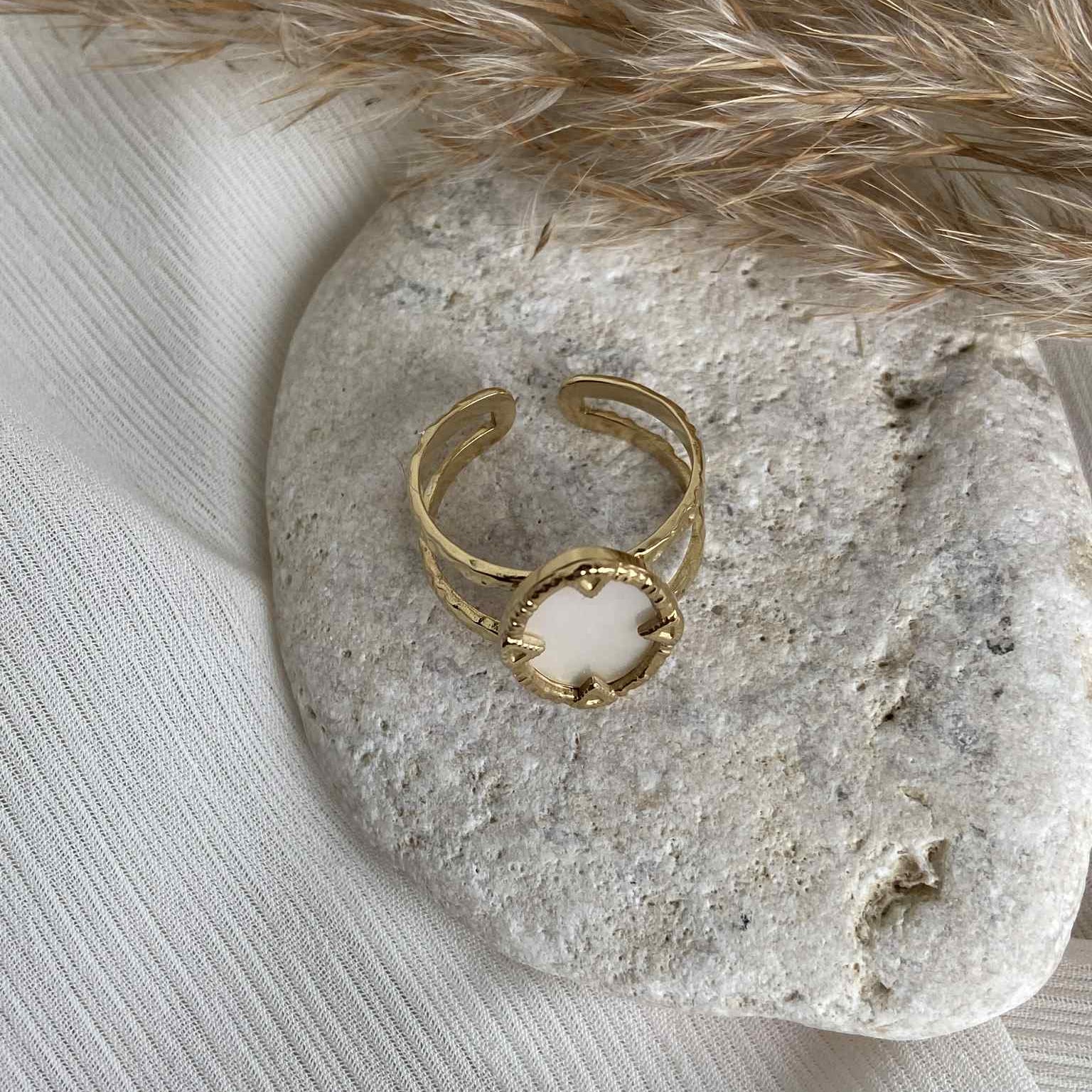 La bague CAMILA met en valeur une élégante pierre nacrée blanche qui apporte douceur et lumière à votre main.