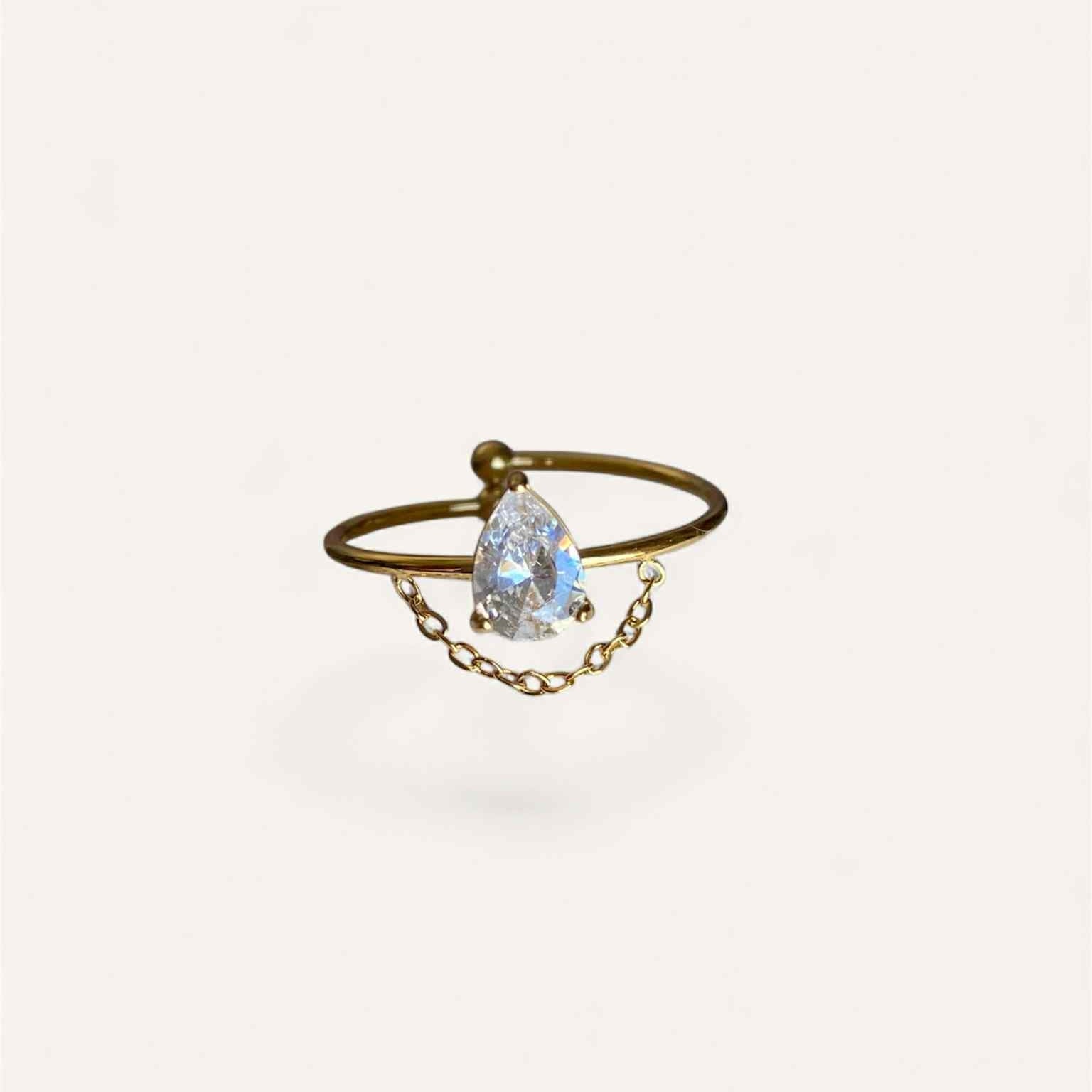 Ajoutez une touche d'éclat à votre look avec la bague LUNA. Son strass central et sa petite chaîne apportent une touche de sophistication à cette bague simple. Parfait pour toutes les occasions.