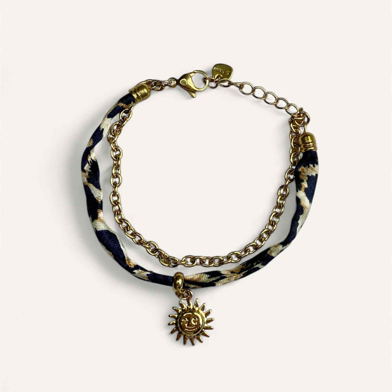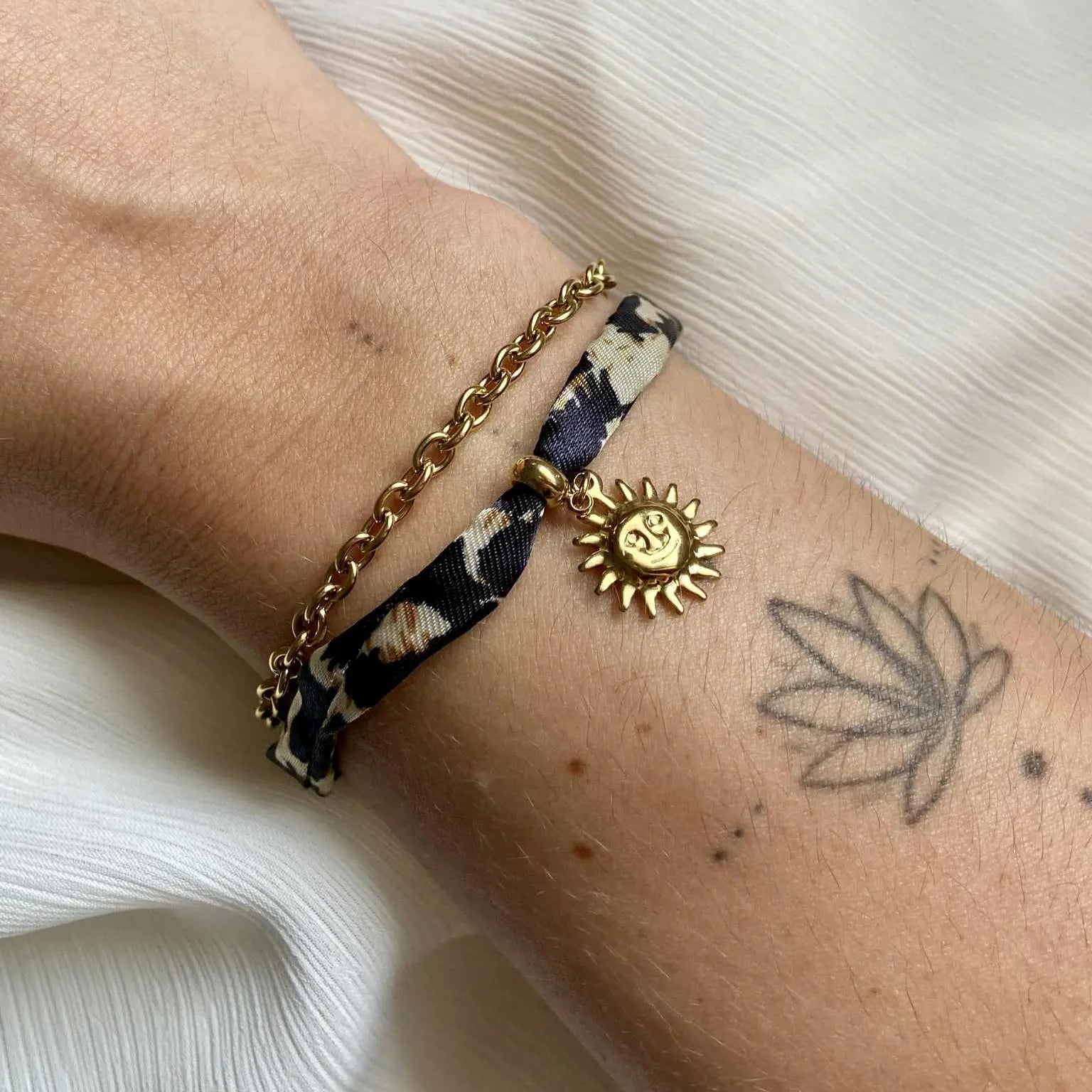Le bracelet JOANNA mélange parfaitement élégance et originalité avec son petit soleil doré délicatement suspendu à un tissu léopard tendance. Accompagné de sa chaîne dorée, cette combinaison subtile apporte une touche sophistiquée et audacieuse à votre poignet, idéale pour rehausser vos tenues.