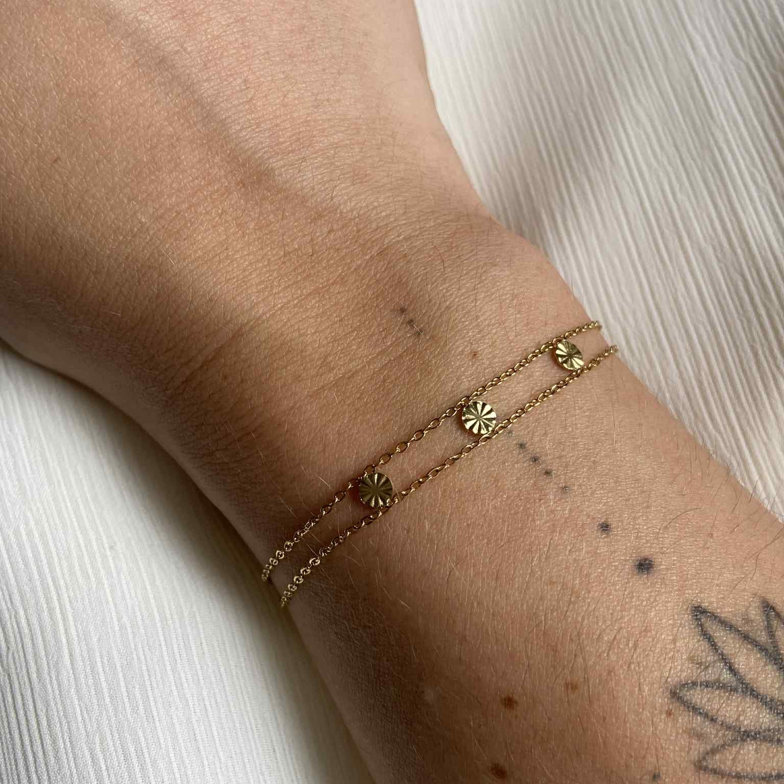 Le bracelet SALMA est très élégant il possède une double chaîne et des petits pendentifs ronds il sera parfait pour pour compléter votre tenue et ajouter une touche de sophistication à votre style.