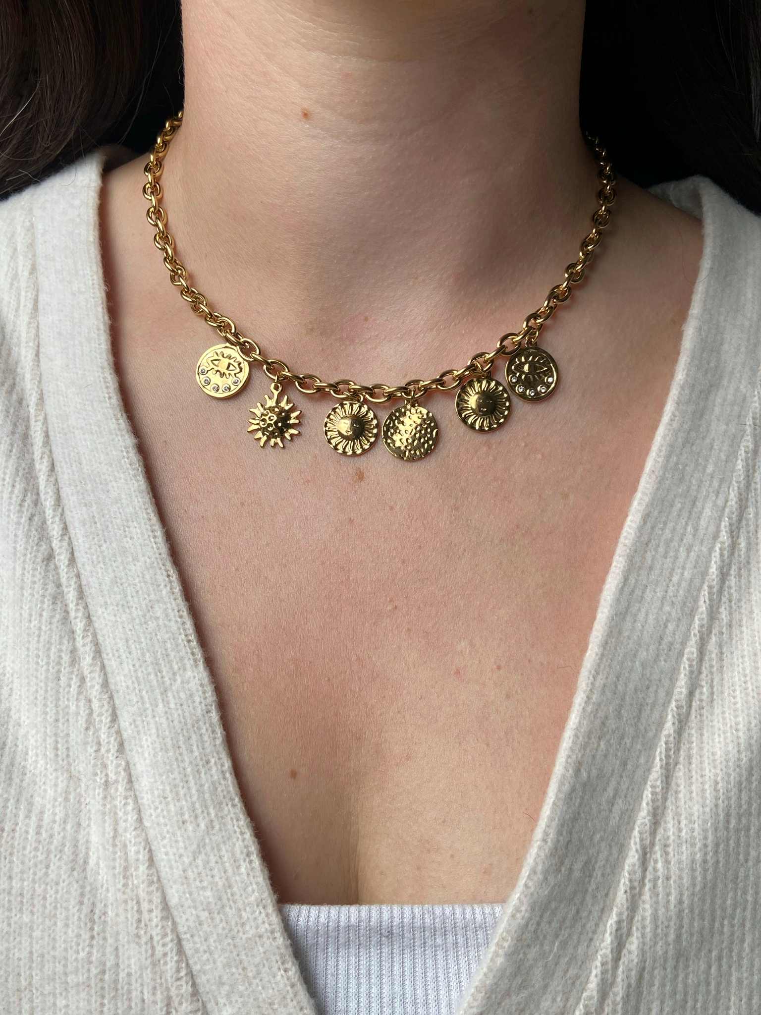 Le collier AMBRE est orné de médailles dorées, ajoutant une touche de sophistication à n'importe quelle tenue. Un accessoire parfait pour les occasions spéciales ou pour rehausser votre look quotidien avec style et classe.