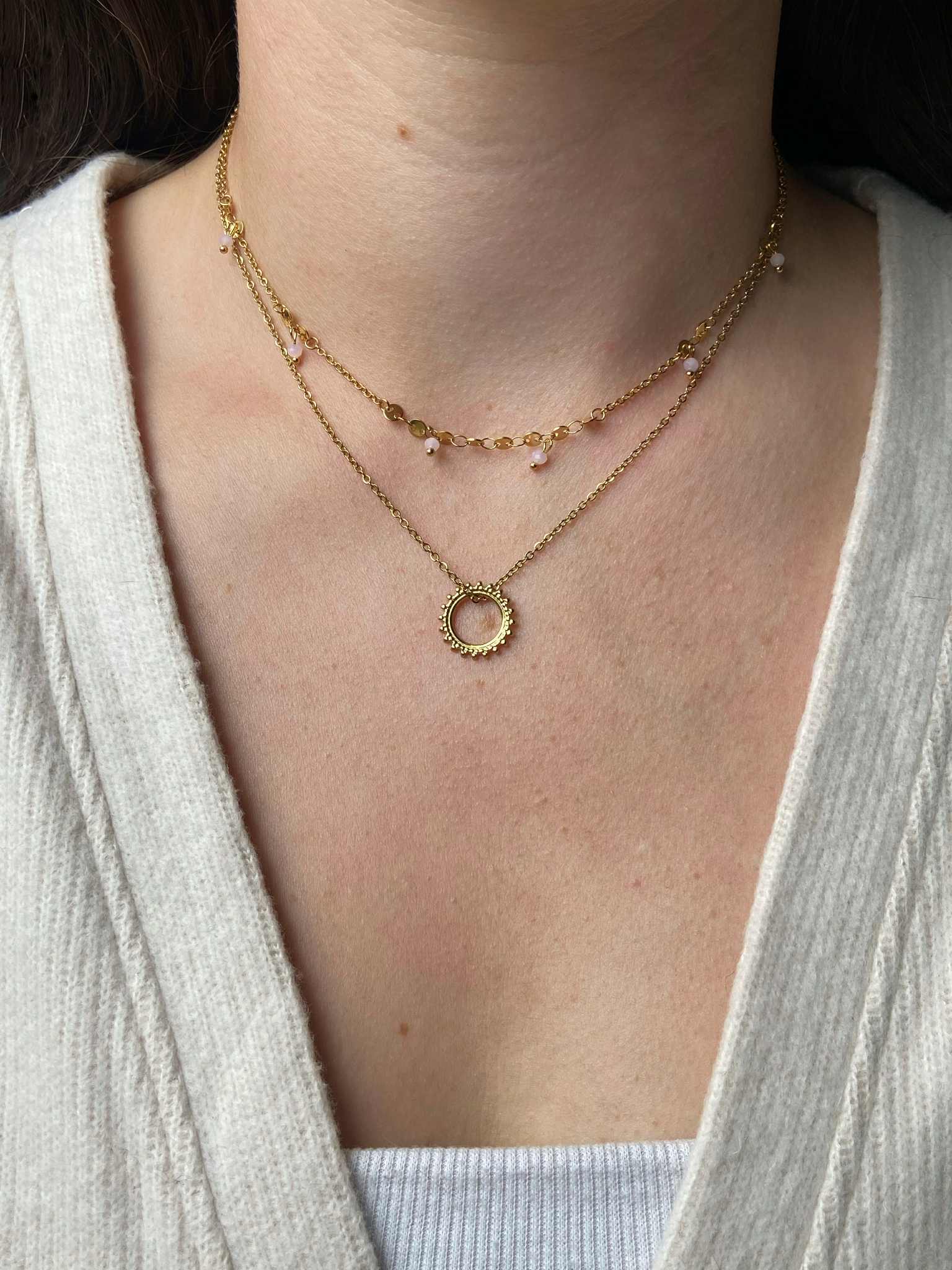Le collier CAROLINA se différencie grâce à ses deux chaînes délicates alliant élégance et douceur avec ses petites perles roses subtilement disposées. Le pendentif en forme de soleil apporte une touche lumineuse et pleine de charme, idéal pour illuminer votre tenue au quotidien.