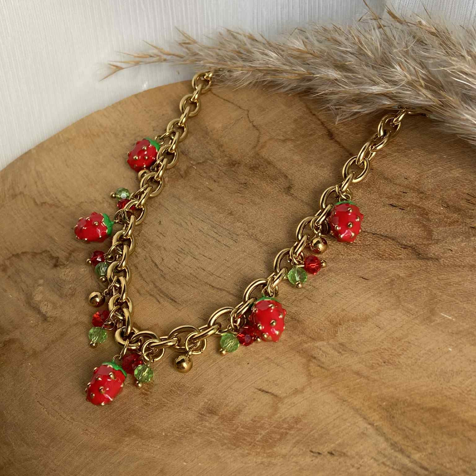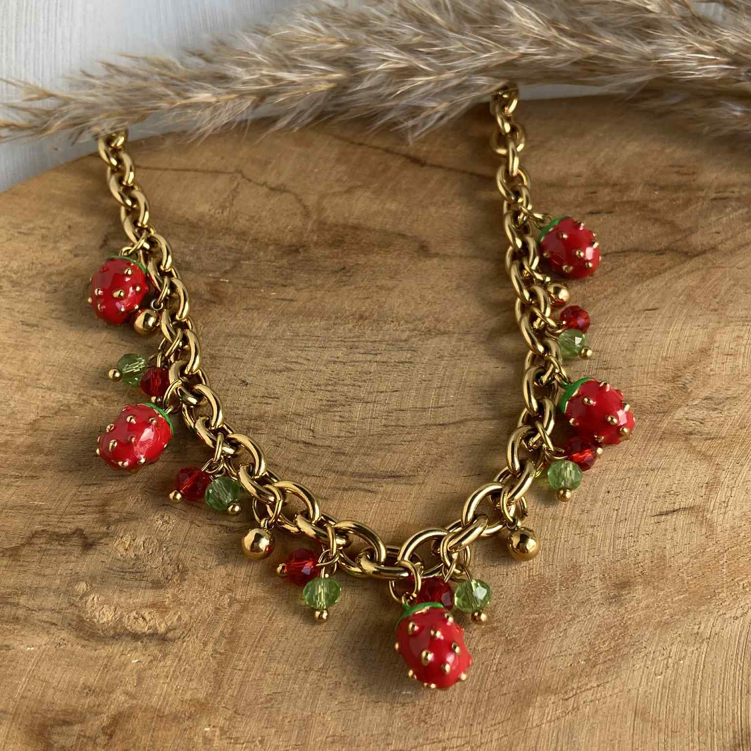 Le collier FELICIA est le bijou parfait pour un look frais et fruité. Le collier doré est orné de plusieurs breloques fraises, ajoutant une touche ludique et charmante à votre tenue. Faites-vous plaisir avec ce collier qui apportera une touche de gaieté à votre garde-robe.