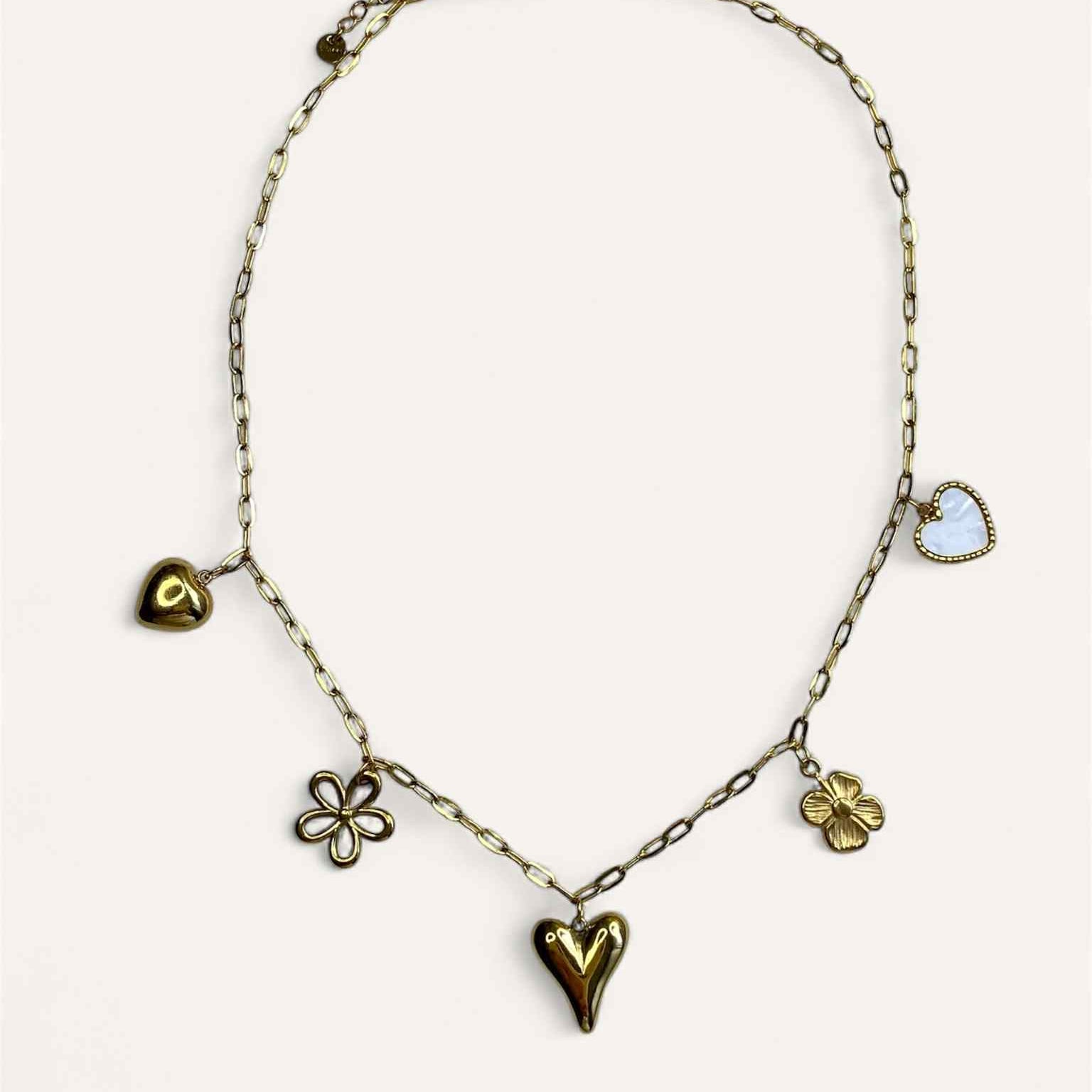 Le collier JOY est orné de breloques en forme de cœurs et de fleurs, apportant une touche délicate et féminine à votre look.