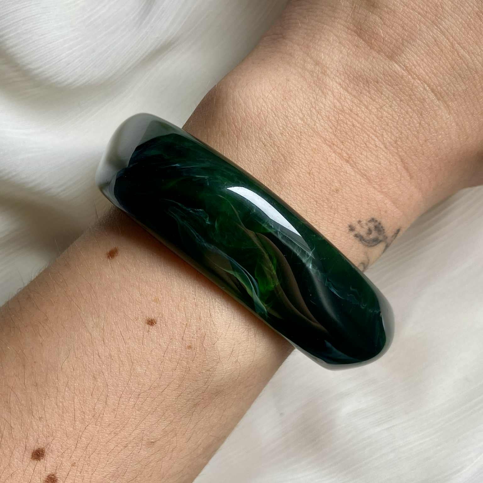 Le jonc en résine VERA, allie un vert profond à une délicate touche de blanc, apportant une élégance discrète à votre style. Léger et confortable, il se porte facilement au quotidien pour une note de couleur subtile.
