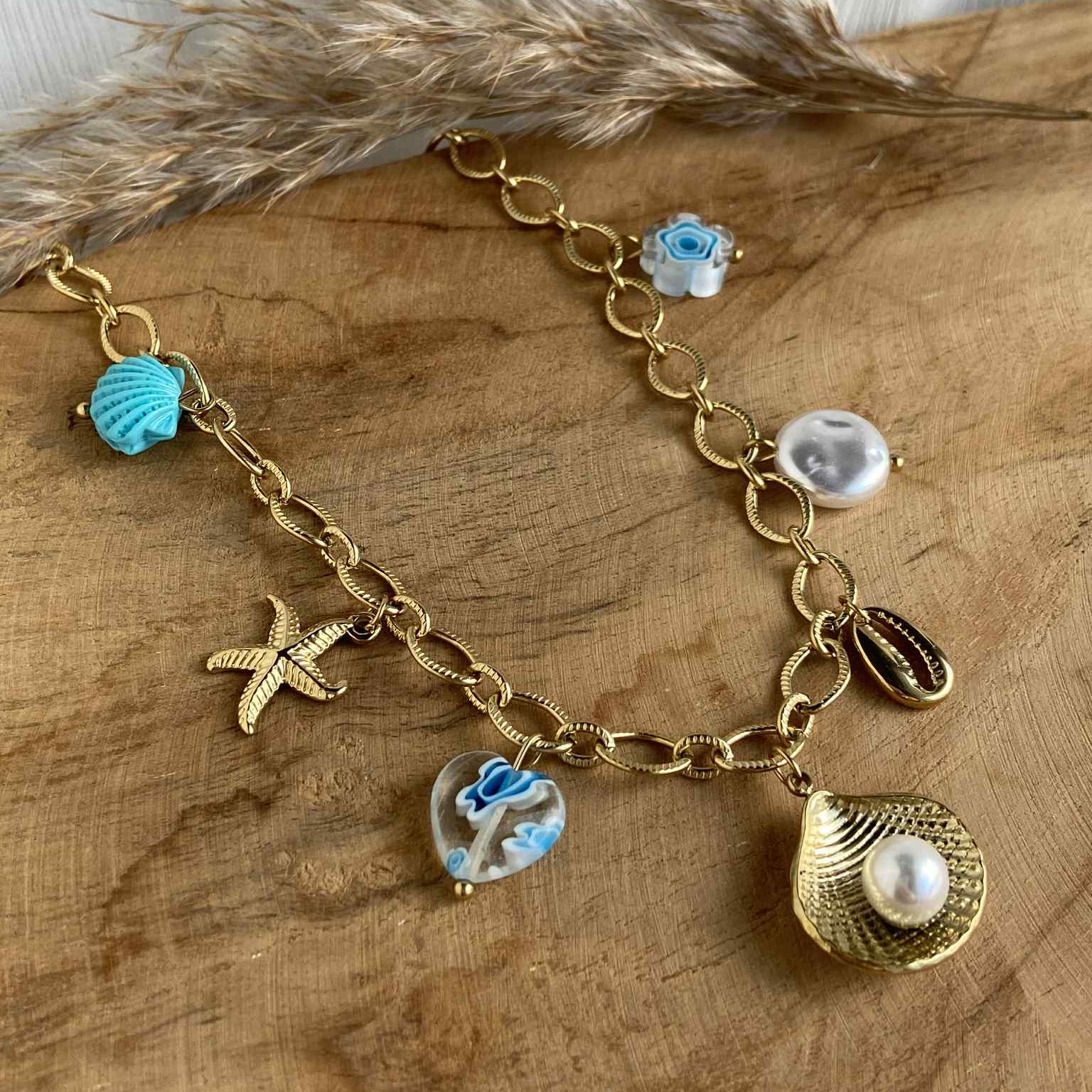 Ce magnifique collier LYA est parfait pour ajouter une touche d'océan à votre tenue. Ses charms marins bleu se marient parfaitement avec la jolie chaîne dorée originale. Ajoutez une touche de couleurs et de style à votre look avec ce collier unique.