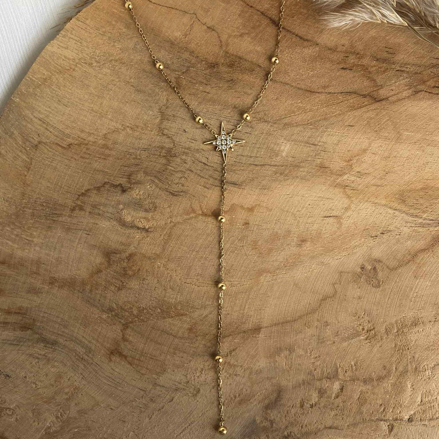 Ajoutez une touche d'éclat à votre tenue avec notre sautoir STELLA. L'étoile centrale en strass ajoute une touche de féminité tandis que la chaîne avec des petites boules dorées apporte une touche élégante et chic. Parfait pour toutes les occasions, ce sautoir est un accessoire incontournable.